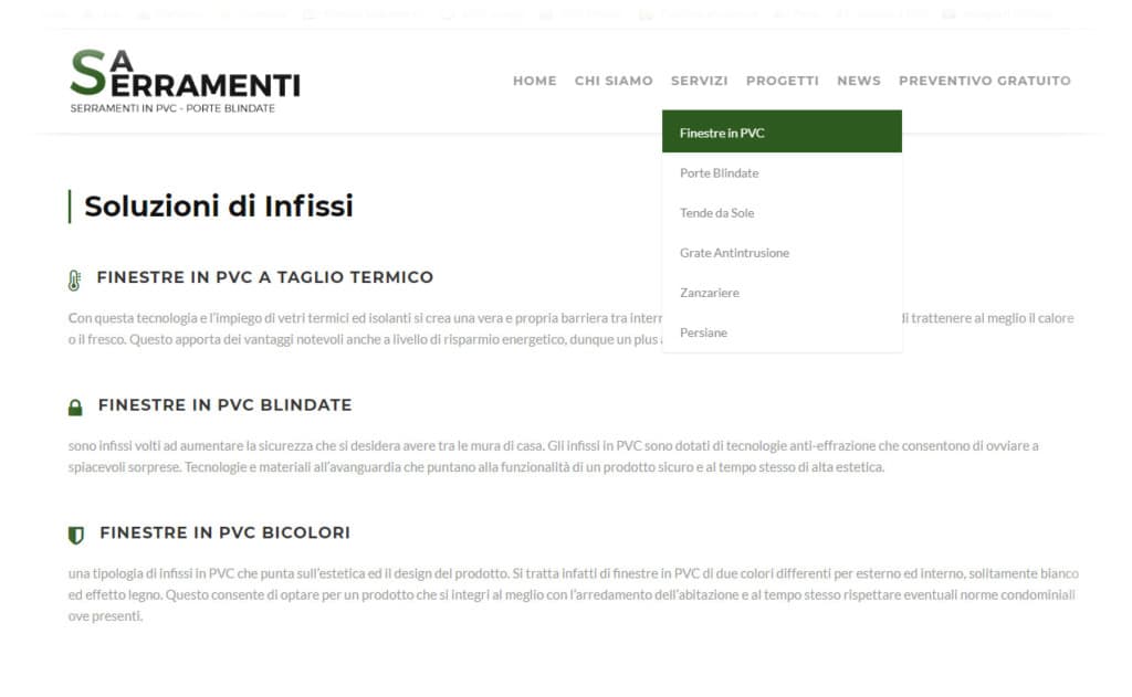 Un messaggio semplice, un sito per una società, SA Serramenti, che produce ed installa infissi, porte e finestre in PVC, soluzioni antintrusione e porte blindate oppure semplici vetrine.